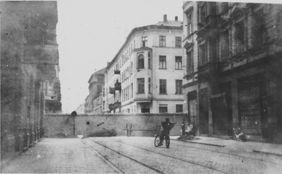 Janusz Sipayłło (zawodowy fotograf, współpracownik AK), widok na skrzyżowanie ul. Chłodnej i Żelaznej w kierunku wschodnim po przejeździe przez metalowe wrota, wczesna wiosna 1942 r., zbiory Muzeum Warszawy.