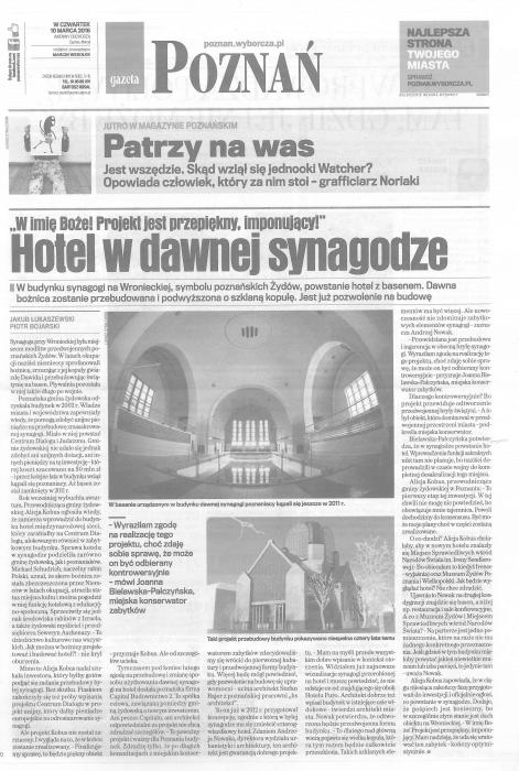 Udostępniamy tekst artykułu Jakuba Łukaszewskiego i Piotra Bojarkiego, a także komentarz Piotra Bojarskiego poświęcony poznańskiej synagodze, przebudowanej przez nazistów na pływalnię i w tym charakterze użytkowanej do 2012 roku. Autor komentarza odnosi się do decyzji miejskiej konserwator zabytków Urzędu Miasta Poznania, która wyraziła zgodę na przebudowę budynku na luksusowy hotel w którym dla wygody gości znajdzie się także basen kąpielowy. Zainteresowanym polecamy artykuł "Wstydem jest... Debata o synagodze w poznańskiej prasie" zamieszczony w czasopiśmie "Miasteczko Poznań" nr 1-2 (2014), którego fragment można znaleźć na naszej stronie w zakładce "czasopismo".